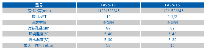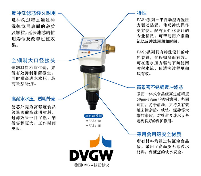 Culligan®康丽根前置过滤器,通常安装在进水管道水表后,可以有效过滤杂质、铁锈、泥沙等大颗粒杂质,确保管网中产生的大量沉淀杂质不会对人体造成伤害。避免水质的二次污染,对管道及涉水设备起到良好的保护作用。 可冲洗前置过滤器: • Culligan®康丽根可冲洗前置过滤器所有材料均经过认证为食品级,采用了无毒涉水材料,保证您的饮水安全。 • 滤芯外壳为食品级聚碳酸酯材料,最高可承受高达1.6 MPa (16 公斤)的进水水压。 • FASp半自动型配有人性化设计的标尺,可帮助用户准确记忆反冲洗周期和时间。 • FASp半自动型内置压力驱动装置,使反冲洗操作更方便。 参 数: