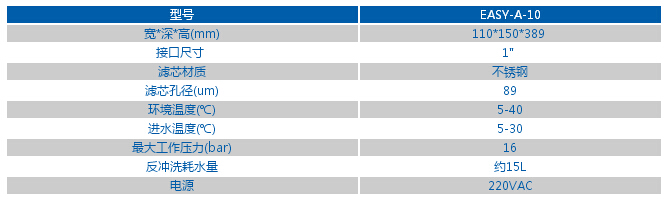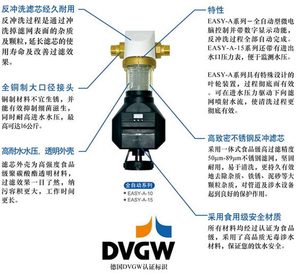 Culligan®康丽根前置过滤器,通常安装在进水管道水表后,可以有效过滤杂质、铁锈、泥沙等大颗粒杂质,确保管网中产生的大量沉淀杂质不会对人体造成伤害。避免水质的二次污染,对管道及涉水设备起到良好的保护作用。 可冲洗前置过滤器: • Culligan®康丽根可冲洗前置过滤器所有材料均经过认证为食品级,采用了无毒涉水材料,保证您的饮水安全。 • 滤芯外壳为食品级聚碳酸酯材料,最高可承受高达1.6 MPa (16 公斤)的进水水压。 • EASY-A全自动型为微电脑控制并带数字显示功能,反冲洗过程全部自动完成。 • EASY-A全自动型以及FASp半自动型还具有特殊设计的叶轮装置,在反冲洗时使水流以更快的速度冲洗滤网,使清洗过程彻底而有效。 参 数:
