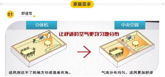 家用中央空调因地制宜调节出回风方式,气流分布均匀,使得整个房间内温度较为均匀,增加了房间舒适性。家用分体机的出回风方式不可调节,使得出风不均匀靠近风口冻成狗,离的远了又没感觉,大大降低了舒适度。