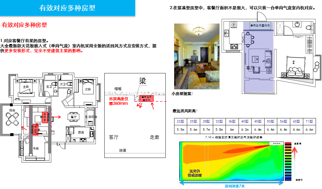 由专业空调设计师根据用户的实际房型条件,结合家用中央空调的特性,配合室内装潢,通过经验值和使用热力负荷计算软件等提供多样化提案,并结合现场勘查,为您提供多样化选配方案。大金PROSHOP专业空调设计工程师用心聆听您的需求,力争给您提供最佳的空调设计,建筑的层高和吊顶高多少?房间的朝向和窗户是怎样的?房间的用途和使用的人群是谁?